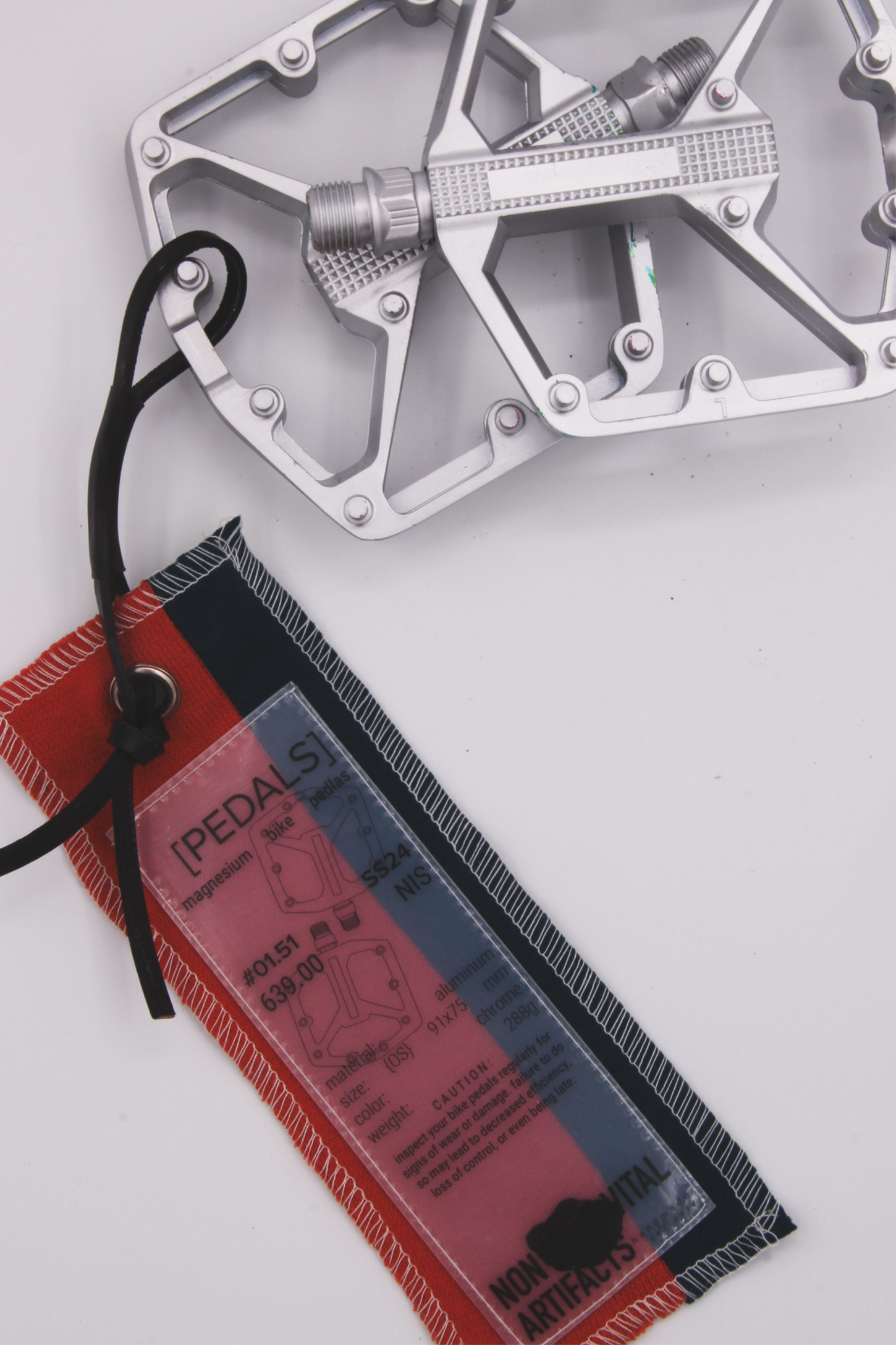 Non Vital Artifacts focuses on cycling accessories, offering products that are undeniably functional but playfully challenge the balance between practicality and aesthetics. Emphasizing the experience of consumer culture and branding, the brand creates a deliberately uncomfortable interaction by attaching oversized tags to the products. These tags are designed to remain on the items as a mark of the brand while also being intentionally inconvenient for the user — a statement on wearing the brand itself. While the products are minimalistic and uniform in appearance, the tags are bold and eye-catching. Additionally, the brand’s unconventional logo features a varying stone symbol on different products, representing an object with no clear functional use, which reflects the essence of the brand’s name.